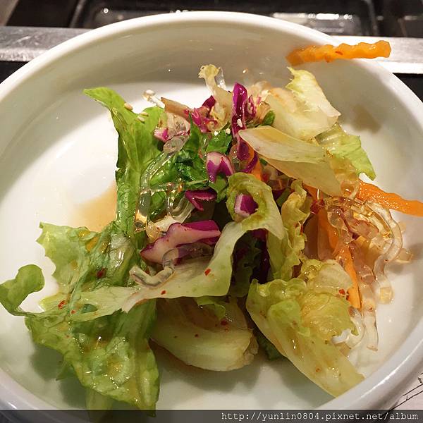 下方「特製沙拉」的份量,已是服務生各分為兩人份的份量,加入韓式風 Sauce 搭上裏頭爽脆、類似的透明粉條,意外的也很好吃。