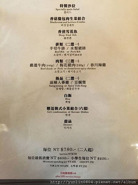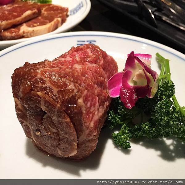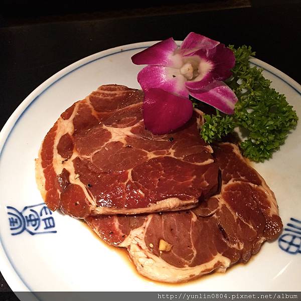因為我們都沒有很餓,又不想花大腦單點(是有沒有那麼懶XD),於是就選了菜單裏價格最低的「傳統碳烤料理」套餐組合,每位NT780(兩人起)加一成服務費,翻翻菜單低消一人也是NT650,小學生的話則為NT250,這份套餐內容其實也頗豐富,有特製沙拉、香菇盤包肉生菜組合、香煎雪花魚、排類(手切牛排/水梨豬排,二選一)、肉類(嚴選牛肉240g/梅花豬肉240g/春川辣雞,三選一)、鍋品(滋補人蔘雞/豆腐煲,二選一)、白飯、韓式小菜組合(六樣)、甜品;上圖為排類中的「手切牛排」,光擺盤就還不賴,大多來說我不愛醃漬、處理過的肉類,因為肉質好其實不需太多調味,否則反而浪費,但『兩班家韓式碳烤』肉類調味下手挺剛好、不會太重,肉質也很嫩,相隔這麼久再來吃,仍是沒甚麼好挑剔耶(尤其是現在吃東西越來越機車XD),GOOD!
