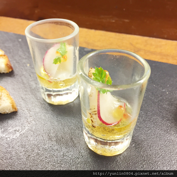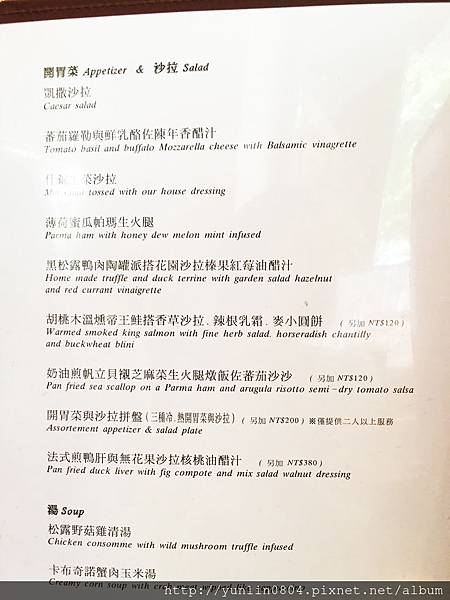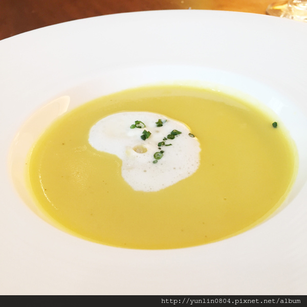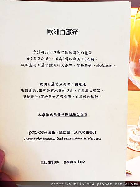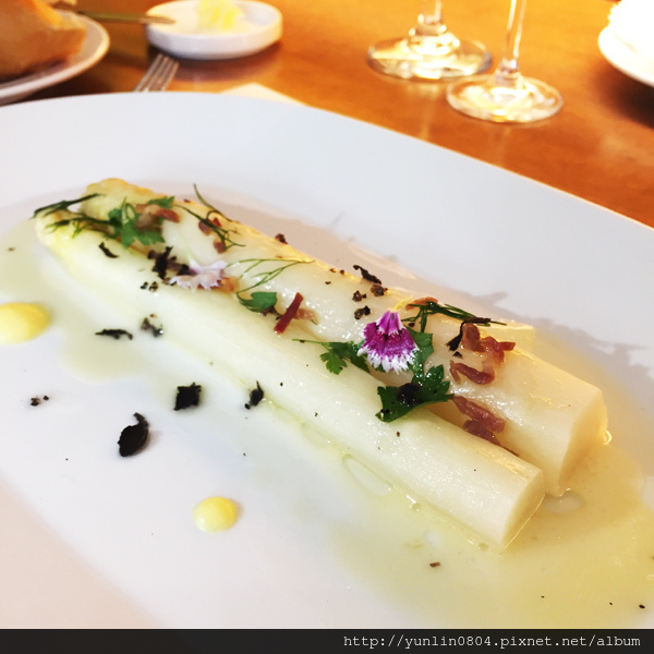 開胃菜:「香草水波白蘆筍、黑松露、淡味奶油醬汁」,價格有兩種算法,單點的話NT580,若套餐的開胃菜&沙拉換成白蘆筍,則多NT380;猶記兩年前與好友玉也有點來嚐嚐,上回纖維感頗重,這次倒是新嫩、清甜細緻。
