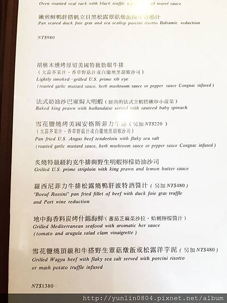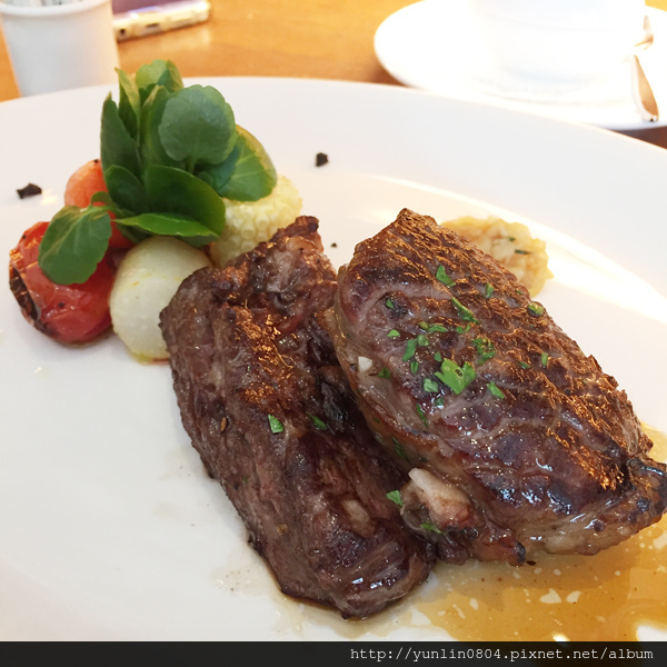 主菜:「胡桃木燻烤厚切美國特級肋眼牛排 NT1,380」,有大蒜芥末汁、香草野菇汁、白蘭地黑胡椒沙司三種醬料可選擇;來過「法森小館」不少次,牛肉這個選項從來沒有出錯過,極度安全又美味。