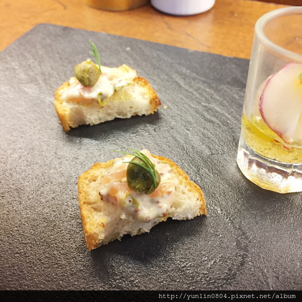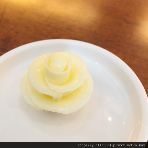 當天非常心血來潮的想吃『法森小館』,電話詢問說兩人就是剩吧檯邊座位,果然就算是平日中午,生意依舊好的不得了呢;一坐定就端上熟悉的美麗玫瑰奶油花。