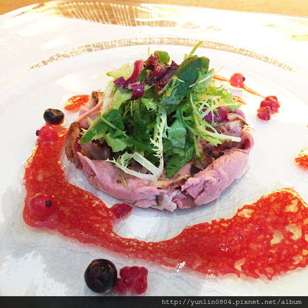 開胃菜:「黑松露鴨肉陶罐派搭花園沙拉榛果紅莓油醋汁」,天啊!在這炙熱的夏季裏微酸的紅莓油醋汁好開胃,搭上肉質軟嫩、略帶甜味的燻鴨肉,好吃極了。