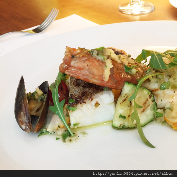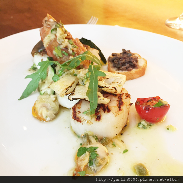 主菜:「地中海香料炭烤什錦海鮮(蕃茄芝麻菜沙拉、蛤蠣檸檬醬汁)NT1,380」,口味清雅、吃起來爽口也會讓女生有飽足感,男生可能就稍嫌不足。