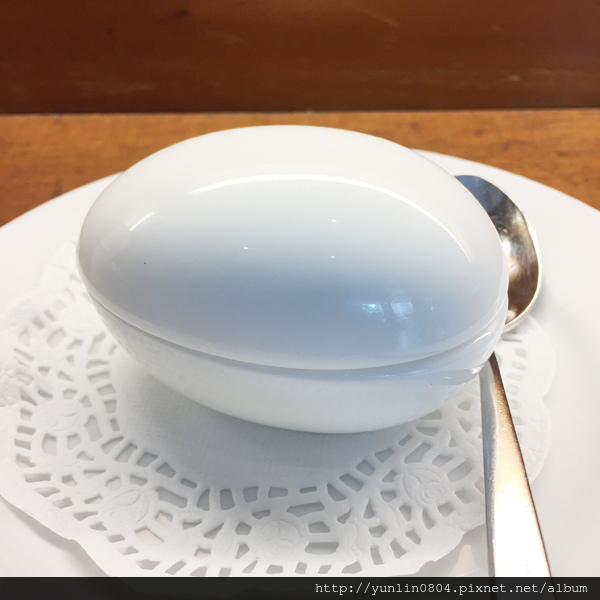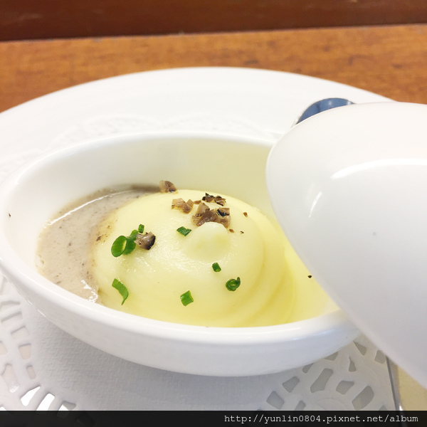 搭配帶著濃郁松露風味的洋芋泥一同食用,盛裝的器皿也煞是可愛,像顆小雞蛋似的。