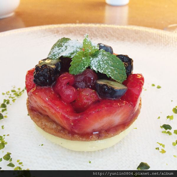 甜點:「沙布列奶油酥餅酒漬森林莓果香草卡士達」,這道甜點完全正中我味蕾,上頭滿滿的莓果類、下方香草卡士達、與中間的奶油酥餅,樣樣皆是心頭好,亦不會太甜膩,邊吃邊嚷嚷這道甜點在外頭花錢單點來吃我都願意!