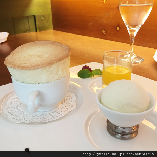 甜點:「香橙甜酒酥芙蕾配香草冰淇淋(需15分烘培時間,另加NT160)」,真心覺得還好,不需加費用點這來吃,酥芙蕾很綿密、但也很軟,甚至口感有些糊糊的,照著服務生推薦吃法,有單吃、和著冰淇淋吃、淋上香橙甜酒一起吃,都無法將它食用完畢。